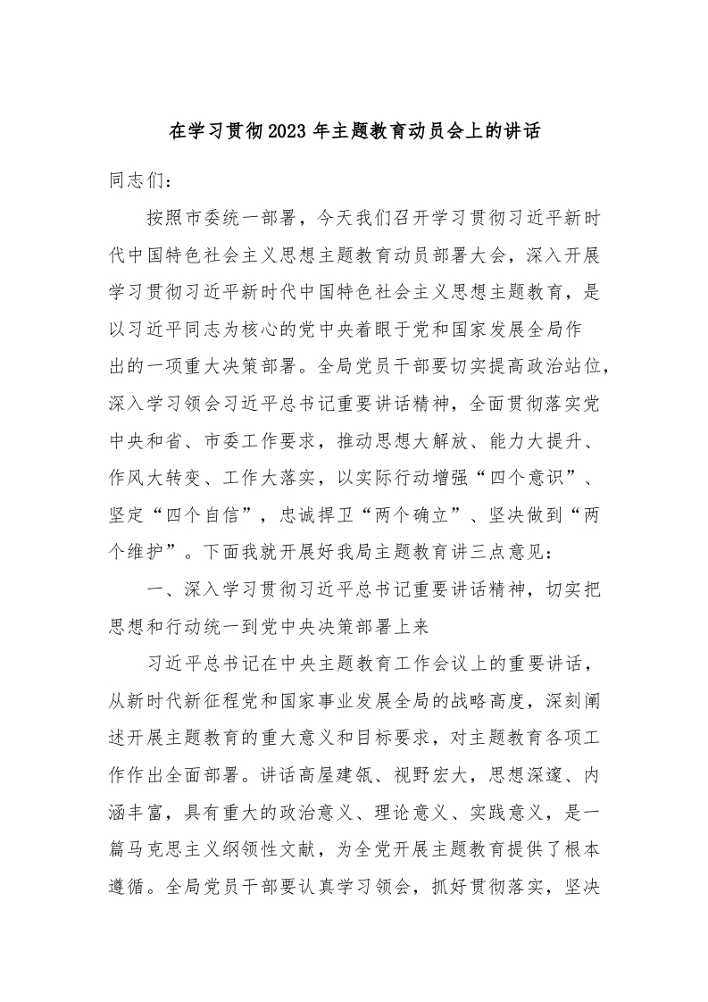 在学习贯彻2023年主题教育动员会上的讲话
