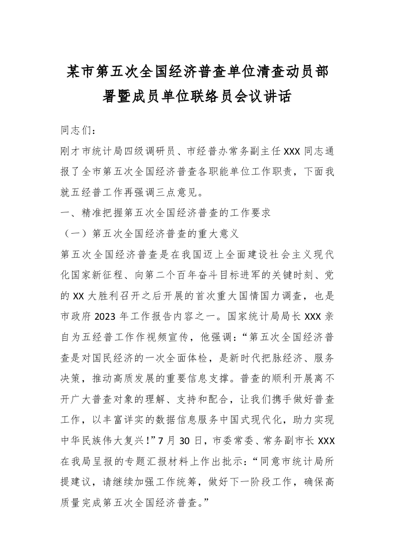 / 某市第五次全国经济普查单位清查动员部署暨成员单位联络员会议讲话