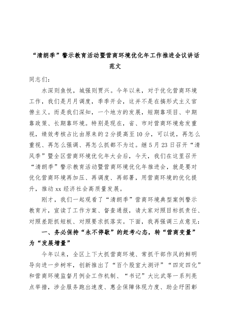 清朗季警示教育活动暨营商环境优化年工作推进会议讲话