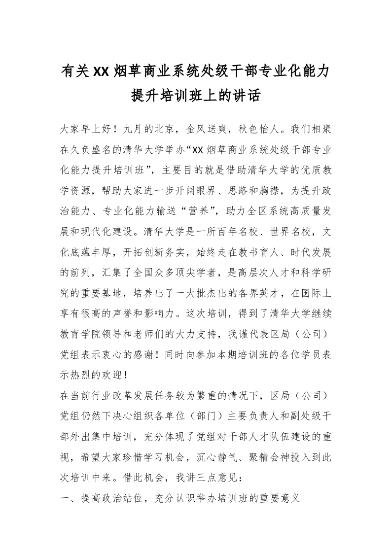 / 有关XX烟草商业系统处级干部专业化能力提升培训班上的讲话