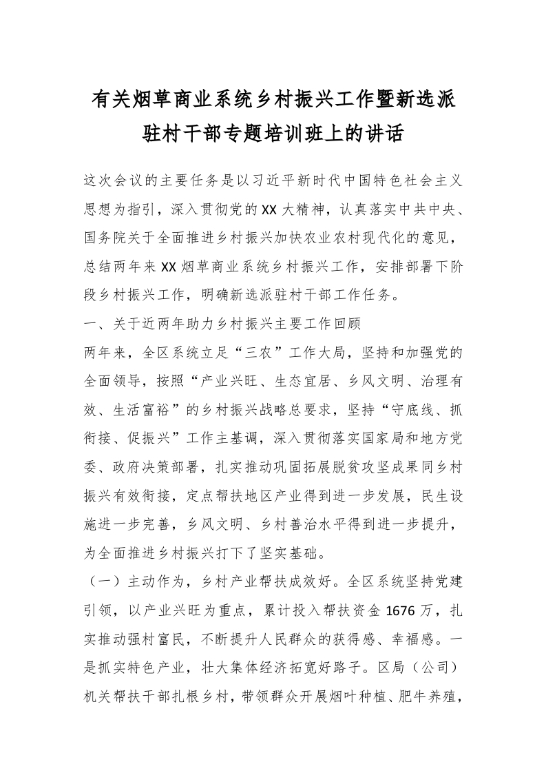 / 有关烟草商业系统乡村振兴工作暨新选派驻村干部专题培训班上的讲话