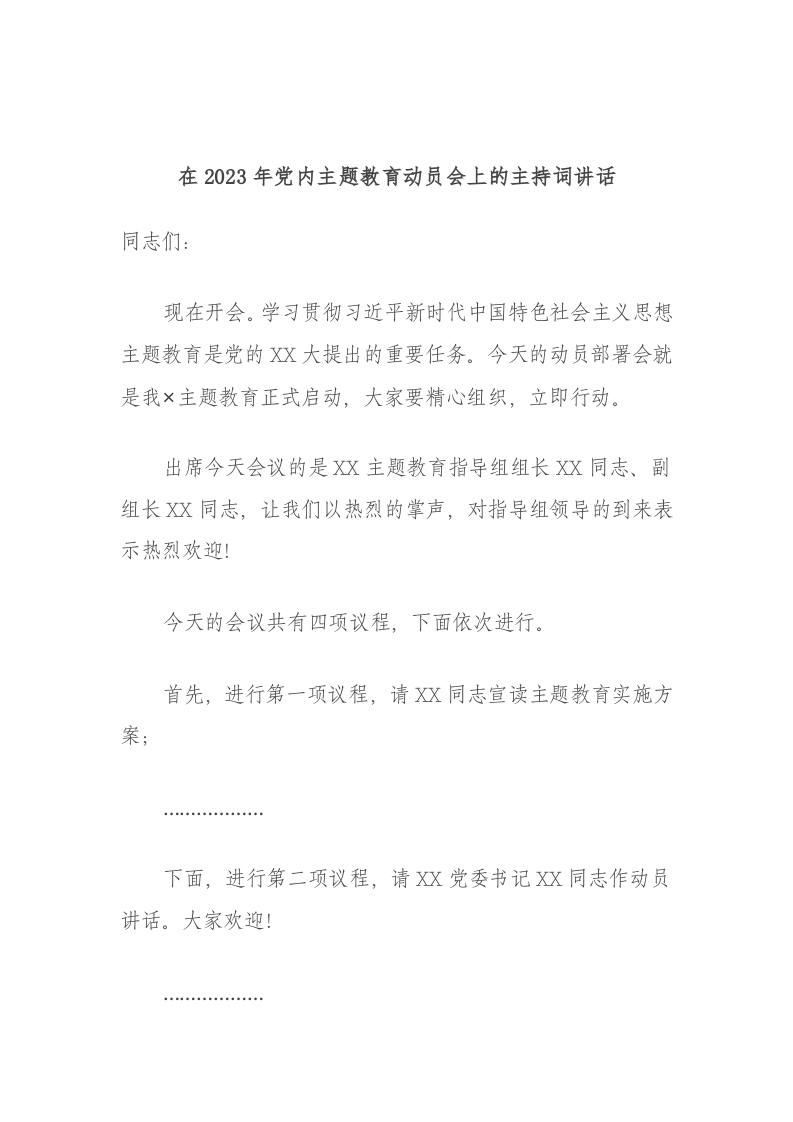 / 在2023年党内主题教育动员会上的主持词讲话