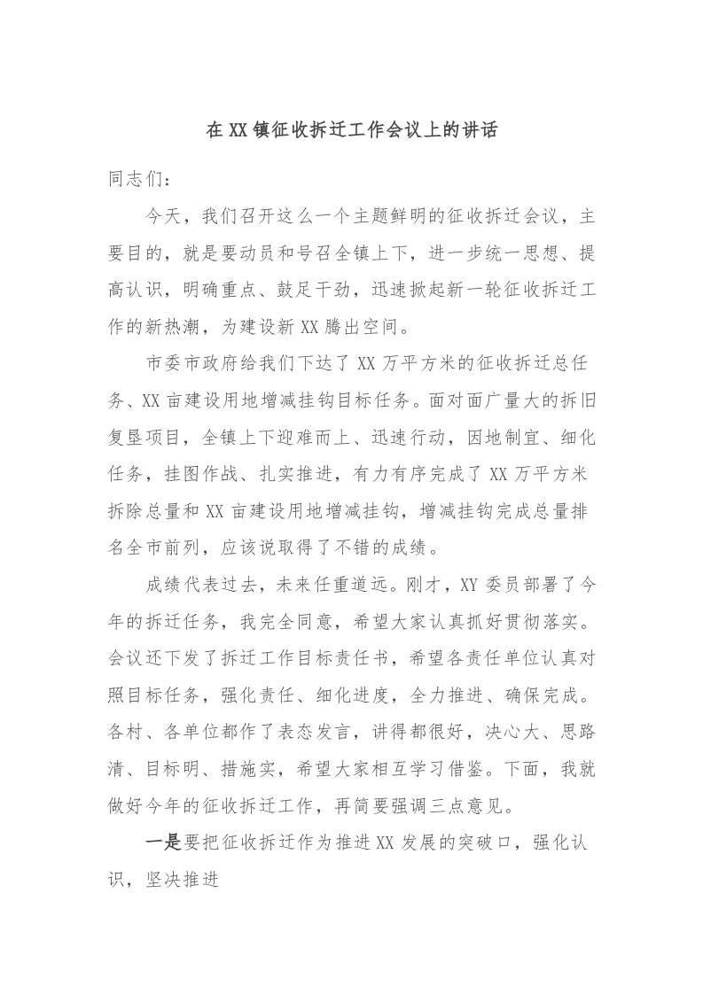 / 在XX镇征收拆迁工作会议上的讲话