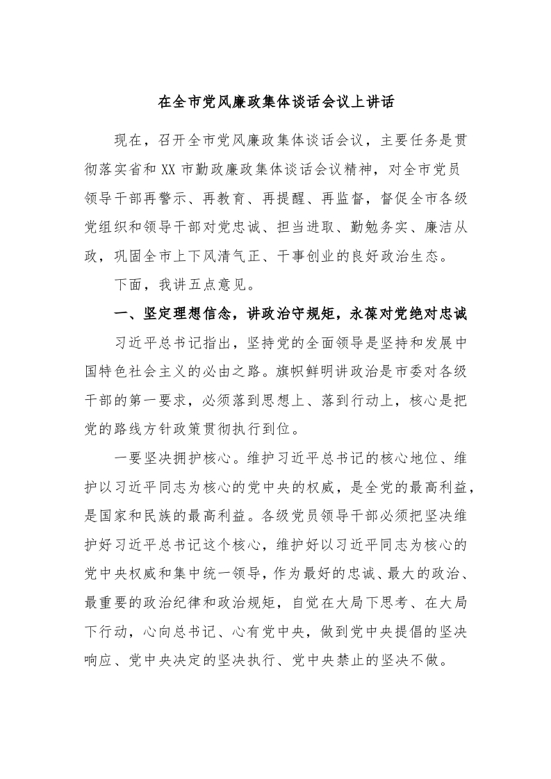 / 在全市党风廉政集体谈话会议上讲话