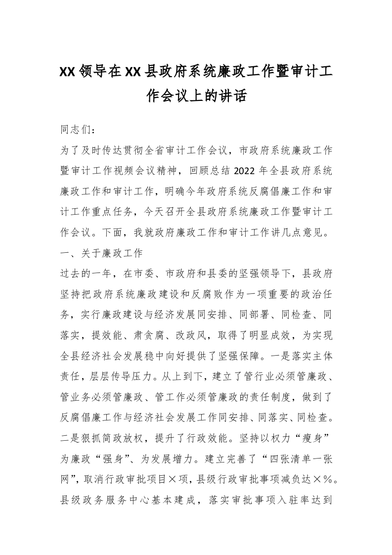 / XX领导在XX县政府系统廉政工作暨审计工作会议上的讲话