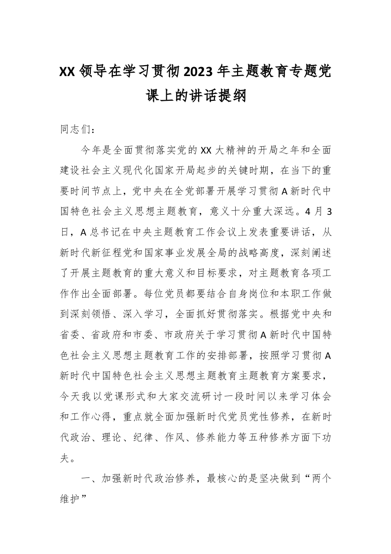 / XX领导在学习贯彻2023年主题教育专题党课上的讲话提纲