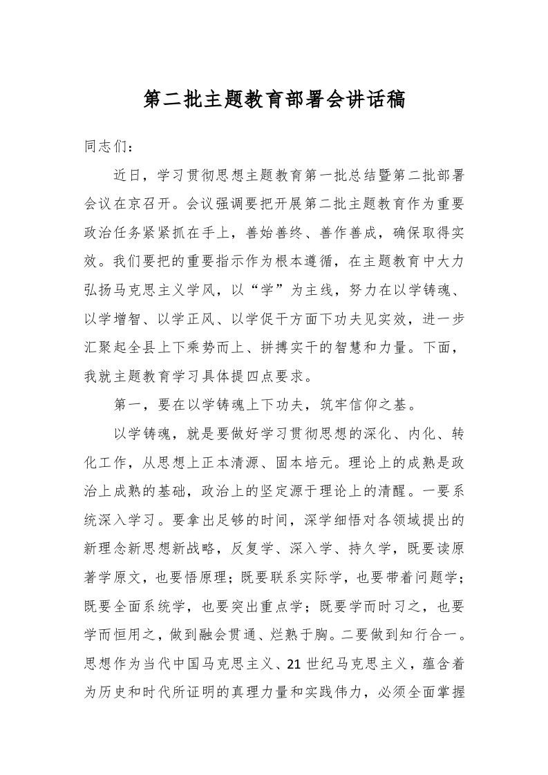 有关第二批主题教育部署会讲话稿