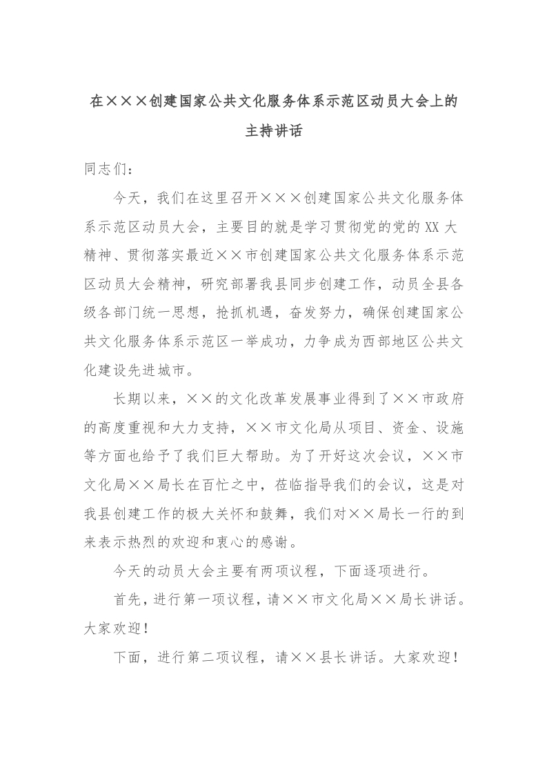 / 在×××创建国家公共文化服务体系示范区动员大会上的主持讲话