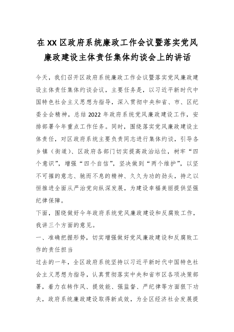 / 在XX区政府系统廉政工作会议暨落实党风廉政建设主体责任集体约谈会上的讲话