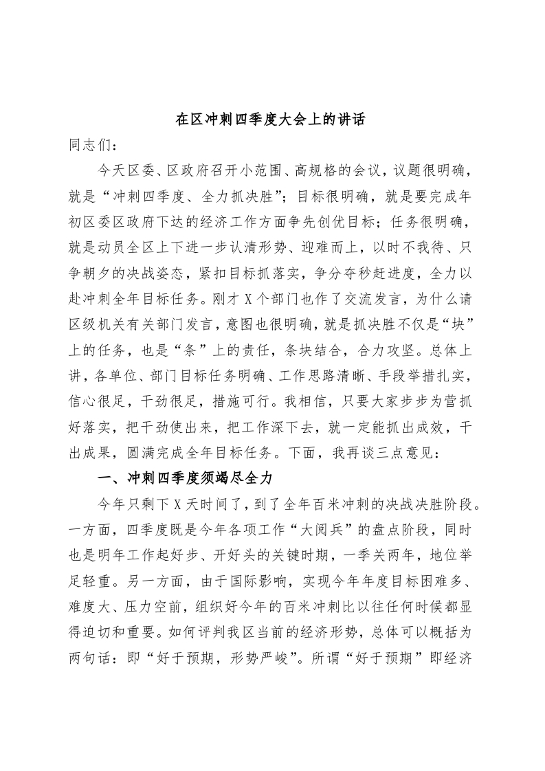 / 在区冲刺四季度大会上的讲话
