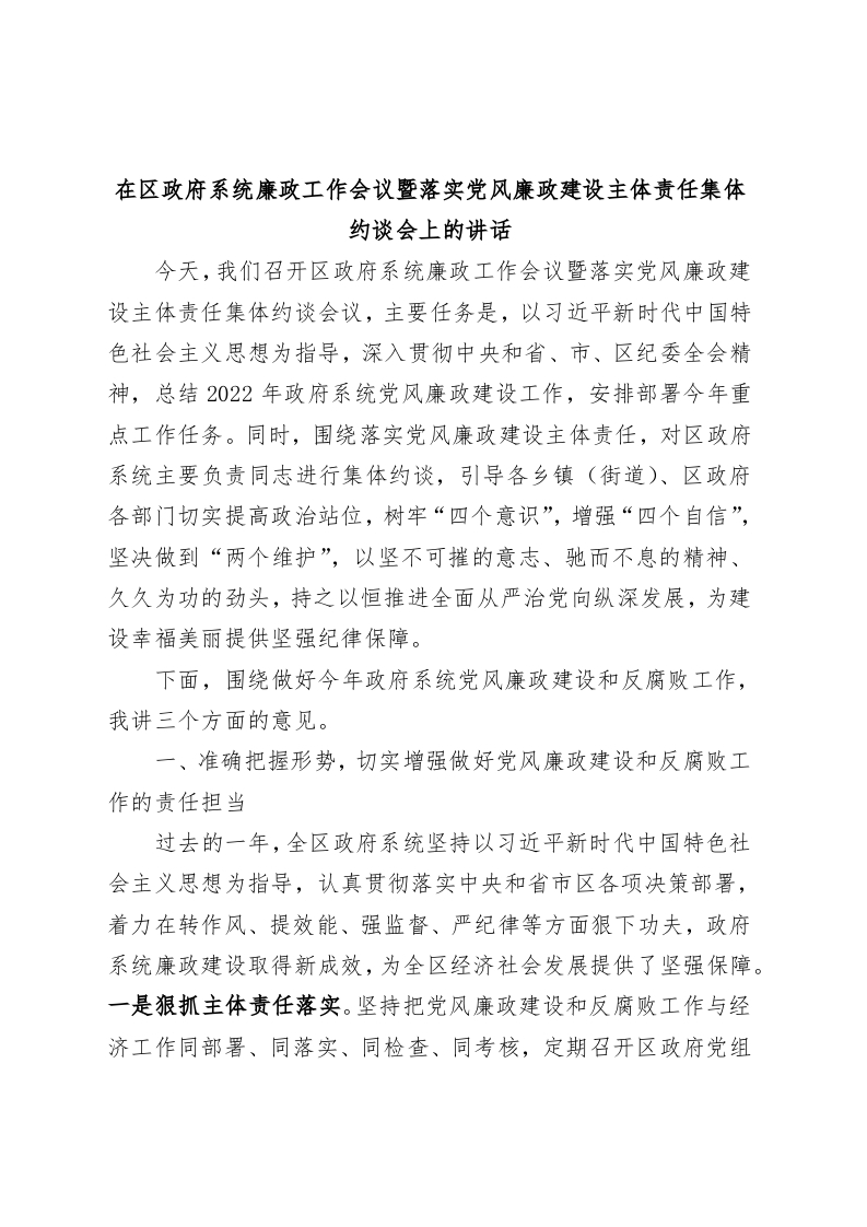/ 在区政府系统廉政工作会议暨落实党风廉政建设主体责任集体约谈会上的讲话