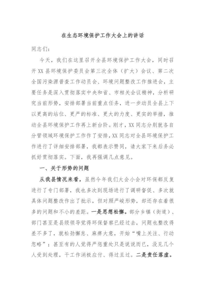 在生态环境保护工作大会上的讲话
