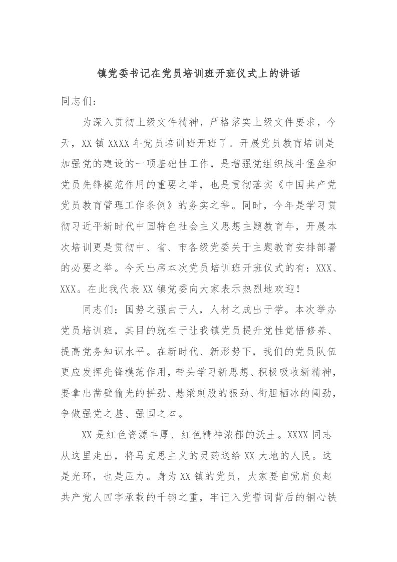 / 镇党委书记在党员培训班开班仪式上的讲话