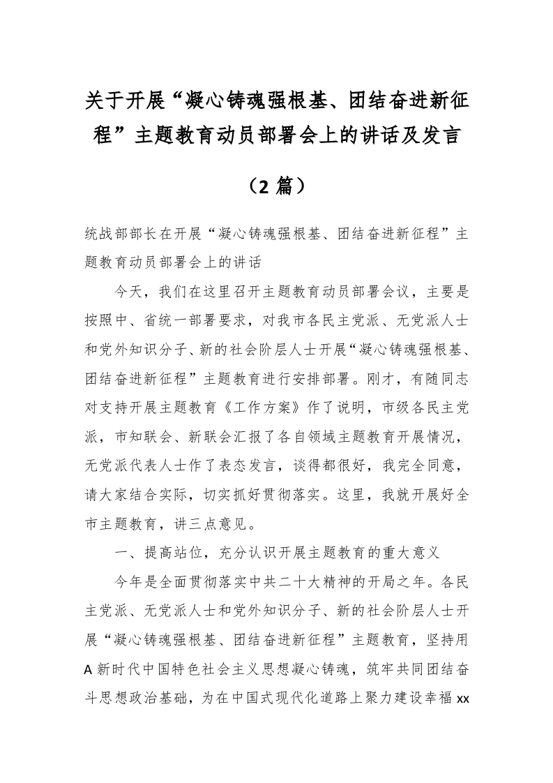 (2篇)关于开展“凝心铸魂强根基、团结奋进新征程”主题教育动员部署会上的讲话及发言