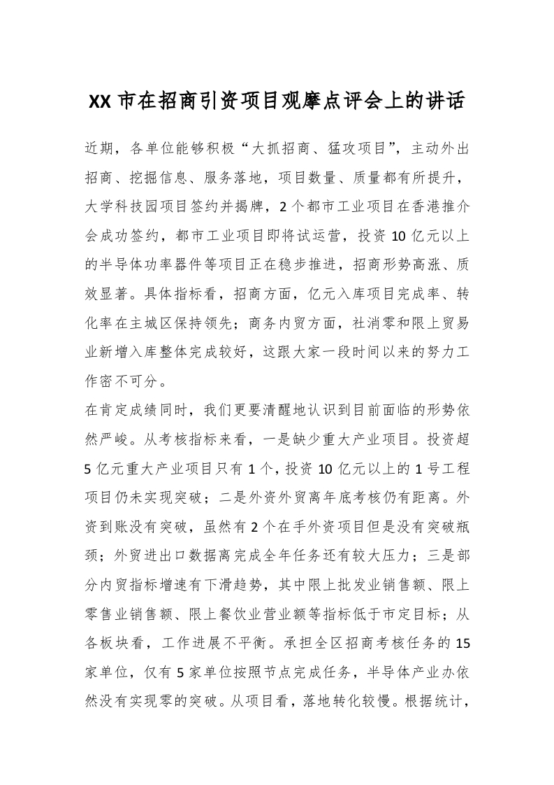 / XX市在招商引资项目观摩点评会上的讲话