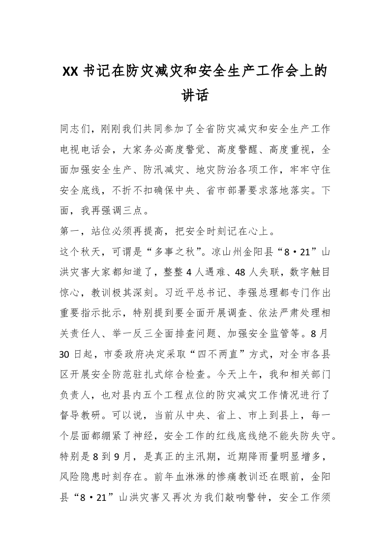 XX书记在防灾减灾和安全生产工作会上的讲话