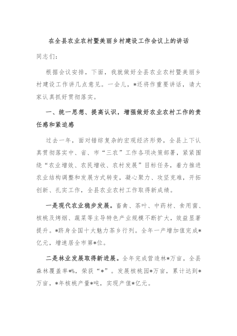 / 在全县农业农村暨美丽乡村建设工作会议上的讲话