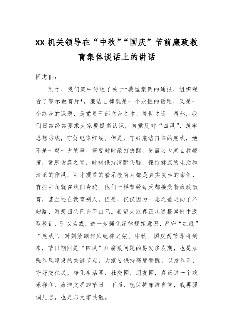 / XX机关领导在“中秋”“国庆”节前廉政教育集体谈话上的讲话