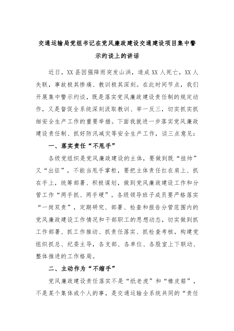 / 交通运输局党组书记在党风廉政建设交通建设项目集中警示约谈上的讲话