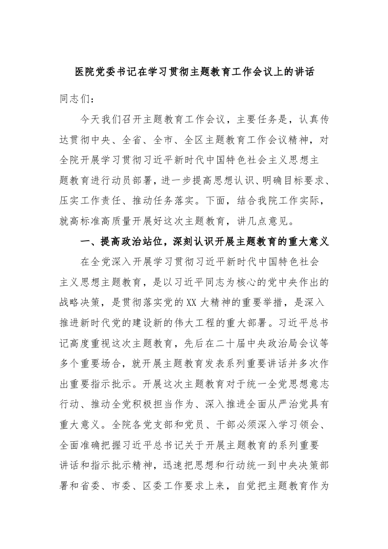 / 医院党委书记在学习贯彻主题教育工作会议上的讲话
