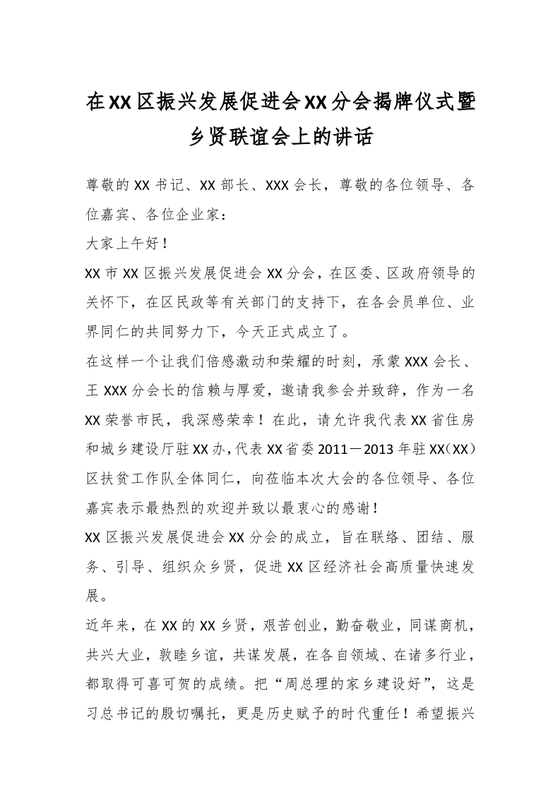 / 在XX区振兴发展促进会XX分会揭牌仪式暨乡贤联谊会上的讲话