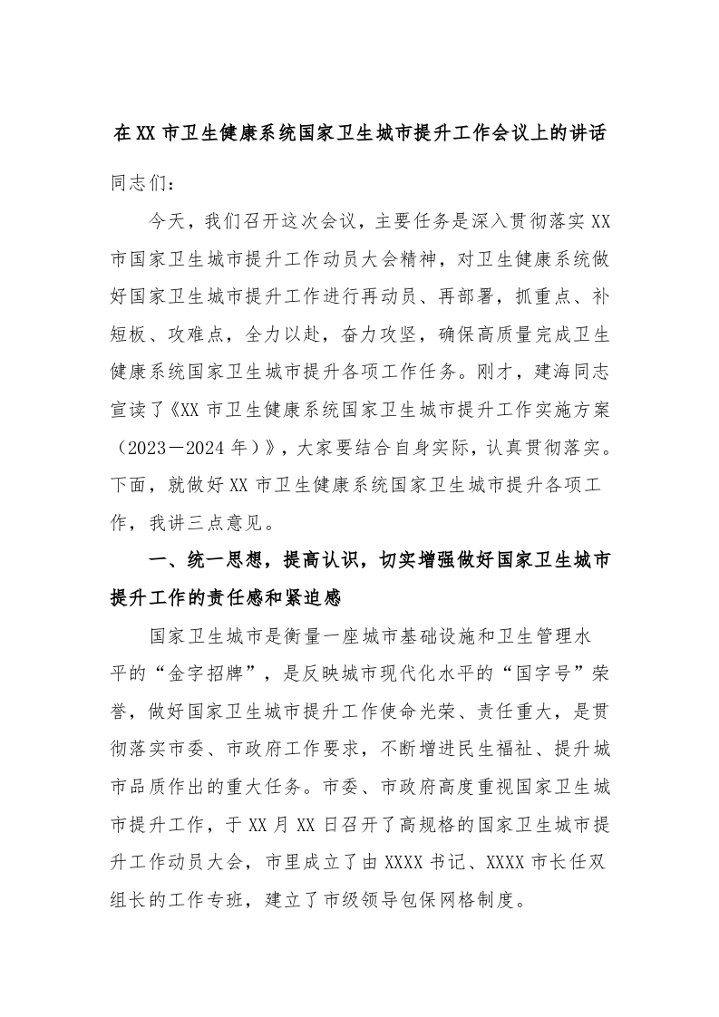 / 在XX市卫生健康系统国家卫生城市提升工作会议上的讲话