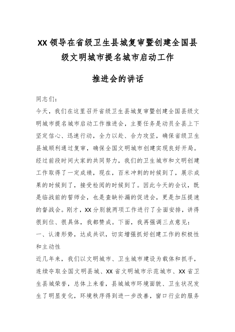 / XX领导在省级卫生县城复审暨创建全国县级文明城市提名城市启动工作推进会的讲话