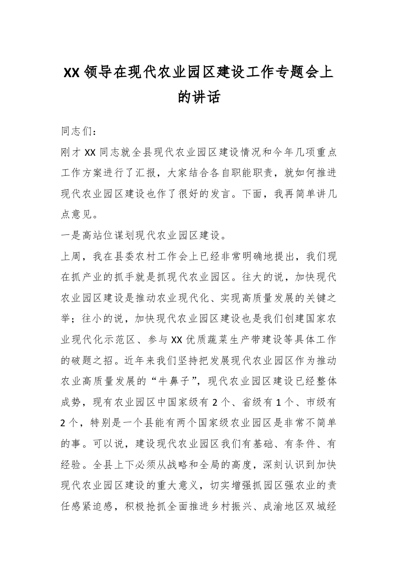/ XX领导在现代农业园区建设工作专题会上的讲话