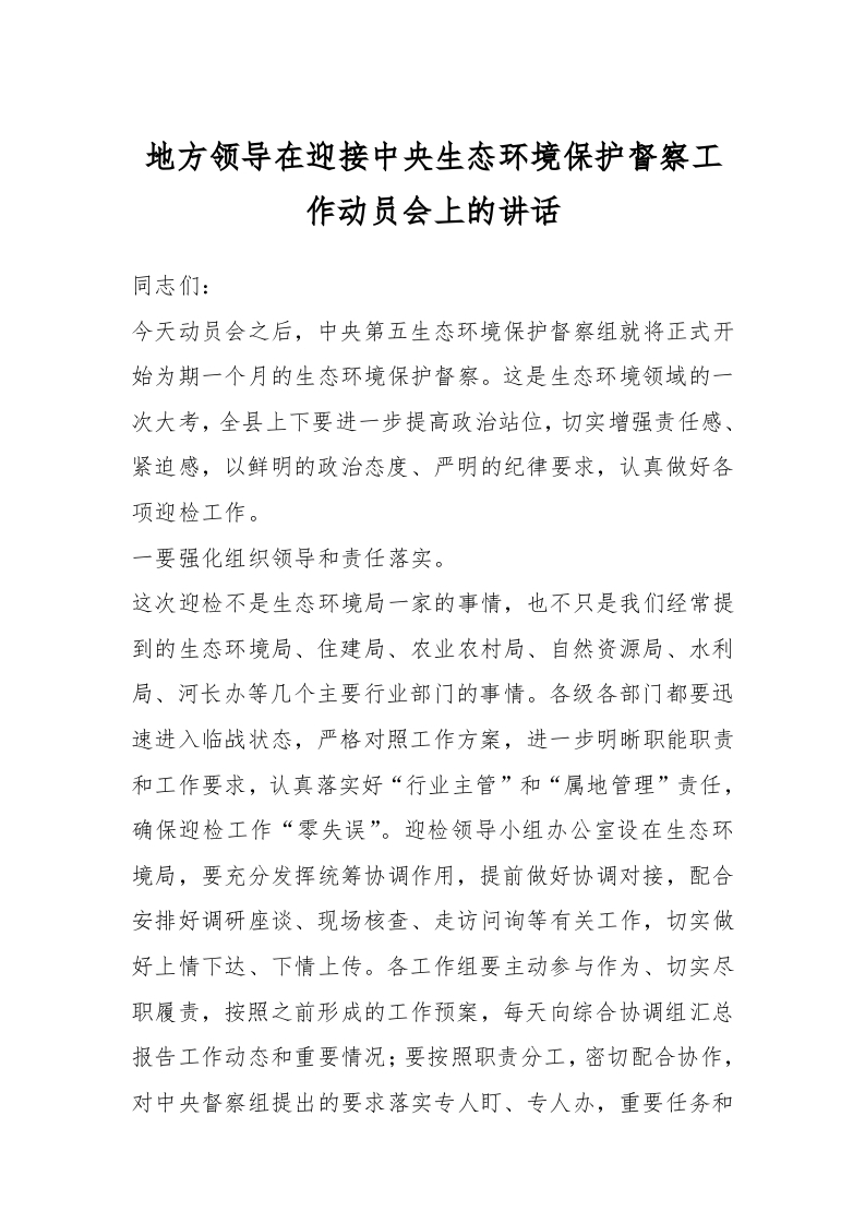 / 地方领导在迎接中央生态环境保护督察工作动员会上的讲话