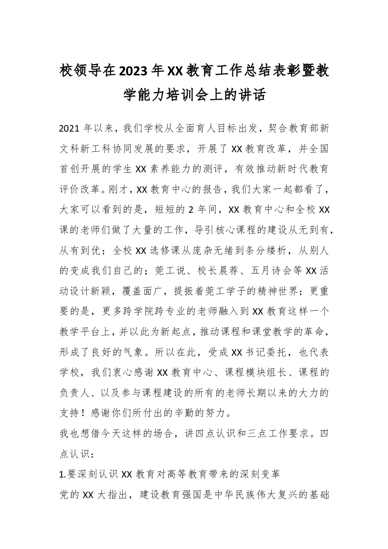 / 校领导在2023年XX教育工作总结表彰暨教学能力培训会上的讲话