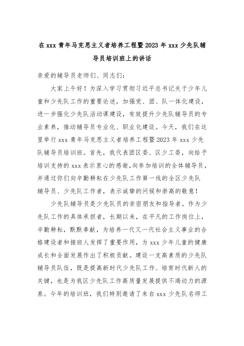 / 在xxx青年马克思主义者培养工程暨2023年xxx少先队辅导员培训班上的讲话