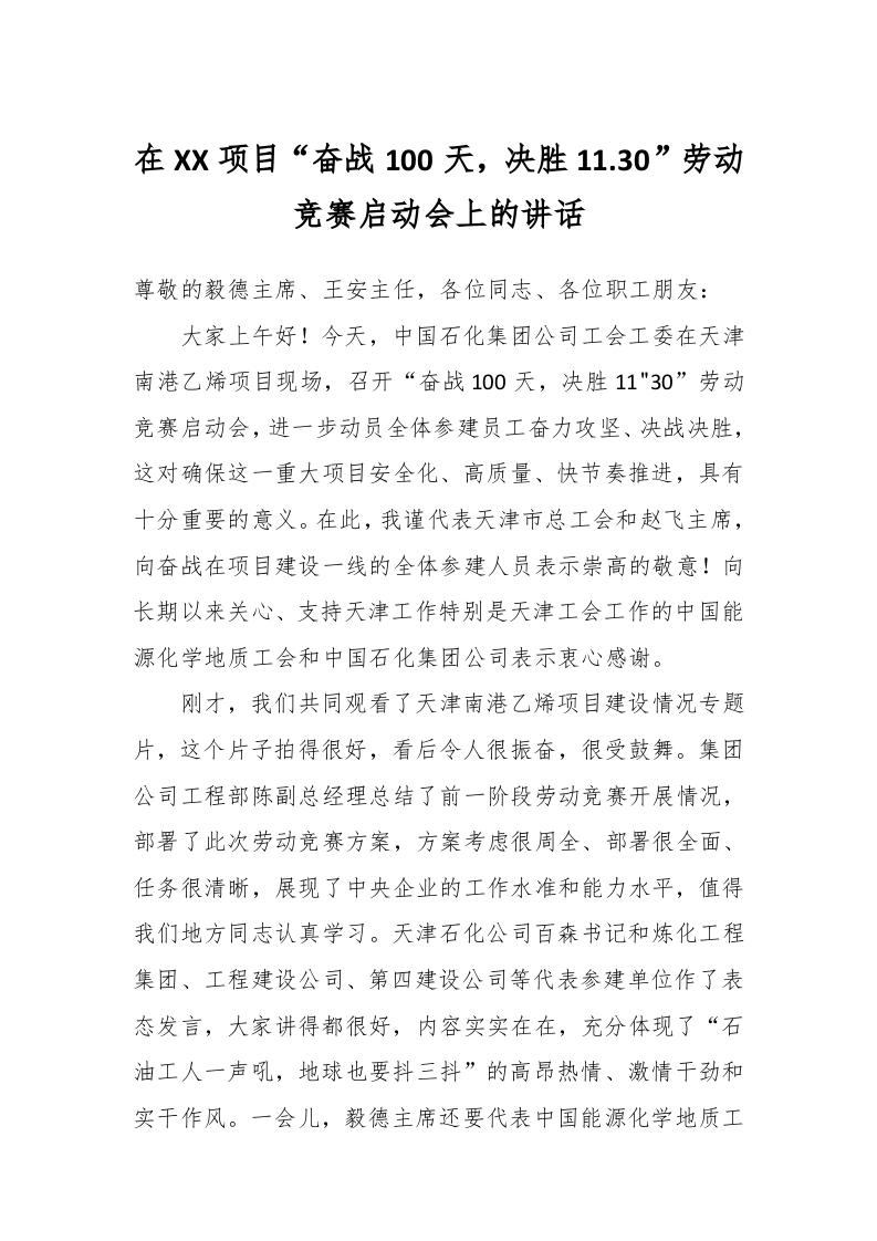 / 在XX项目“奋战100天,决胜11.30”劳动竞赛启动会上的讲话