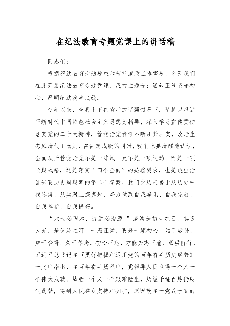 / 在纪法教育专题党课上的讲话稿