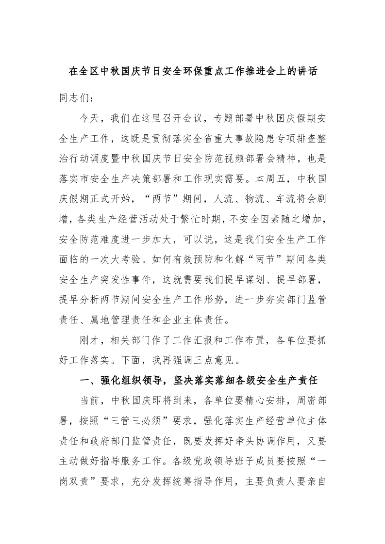 / 在全区中秋国庆节日安全环保重点工作推进会上的讲话