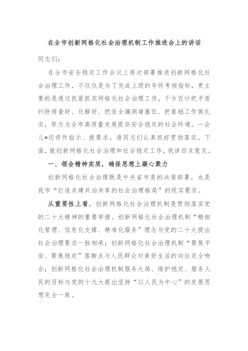 在全市创新网格化社会治理机制工作推进会上的讲话