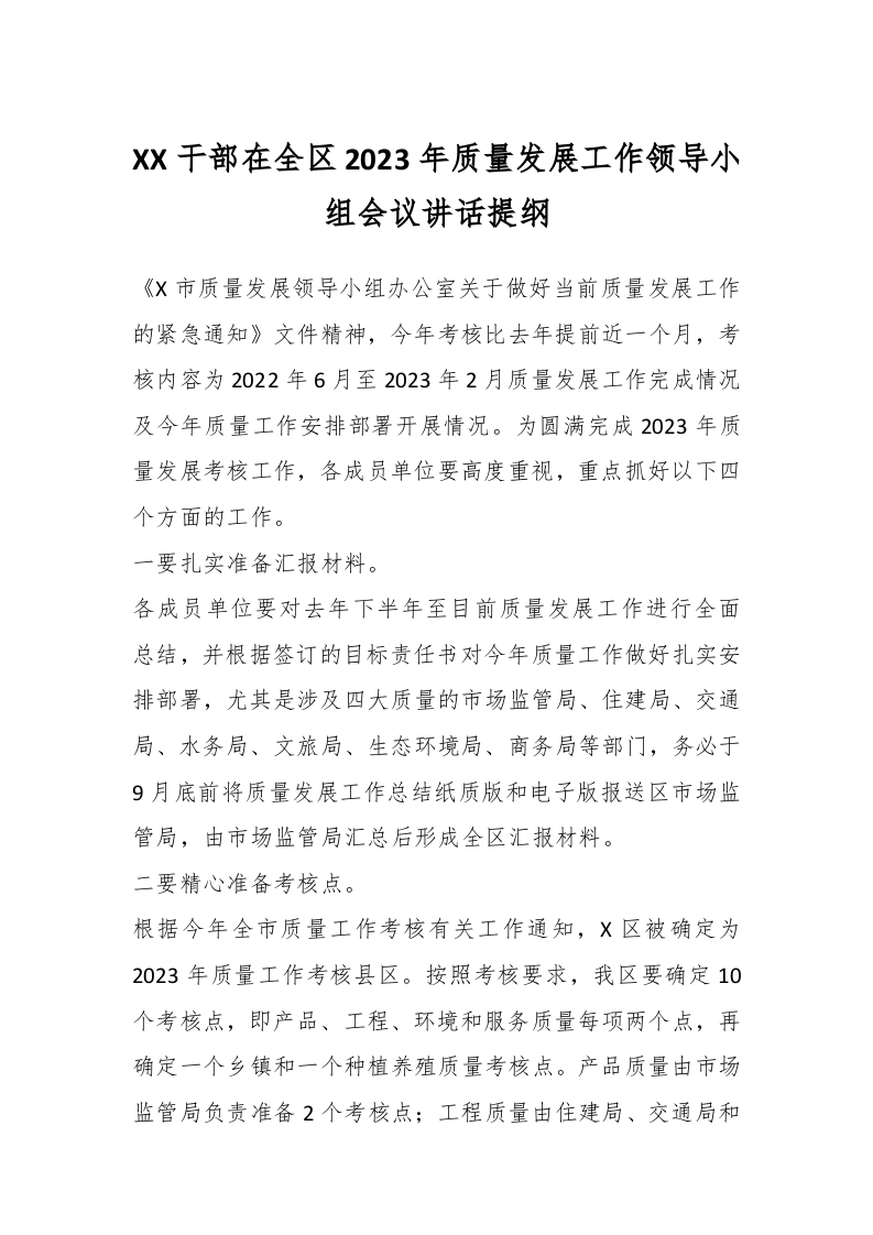 / XX干部在全区2023年质量发展工作领导小组会议讲话提纲