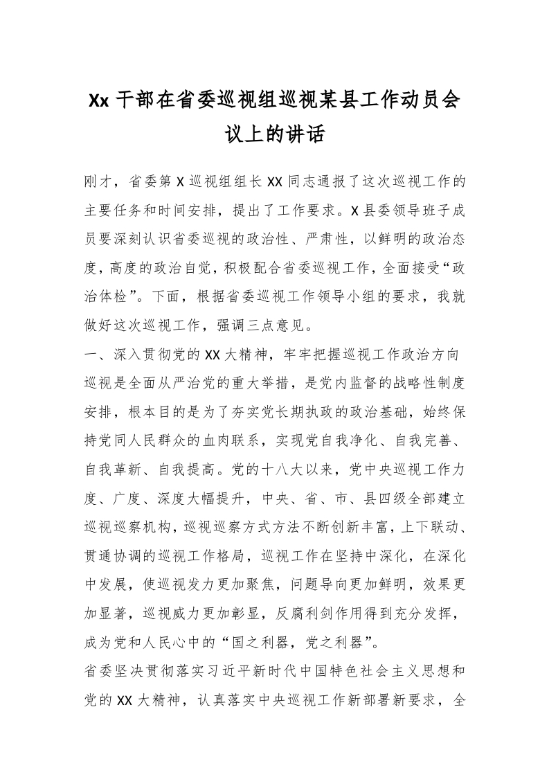 / Xx干部在省委巡视组巡视某县工作动员会议上的讲话