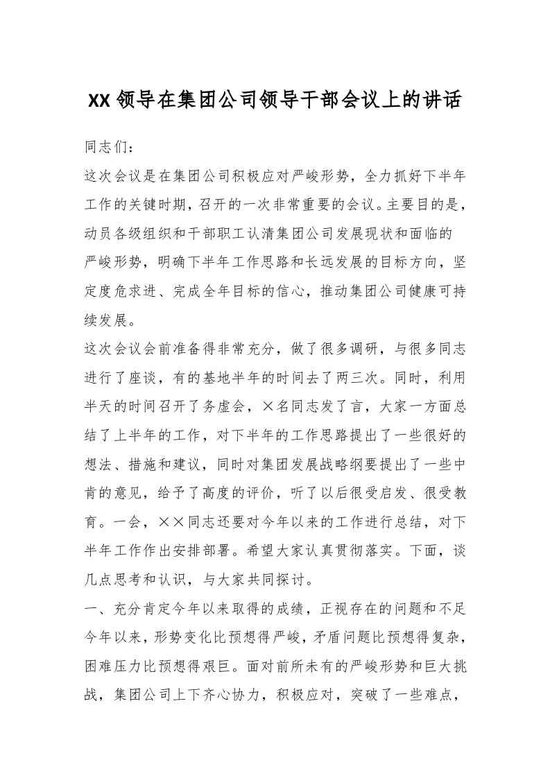 / XX领导在集团公司领导干部会议上的讲话