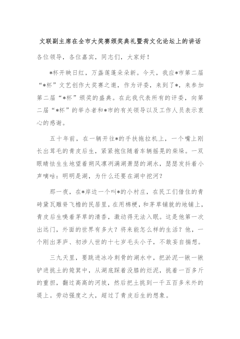 / 文联副主席在全市大奖赛颁奖典礼暨荷文化论坛上的讲话