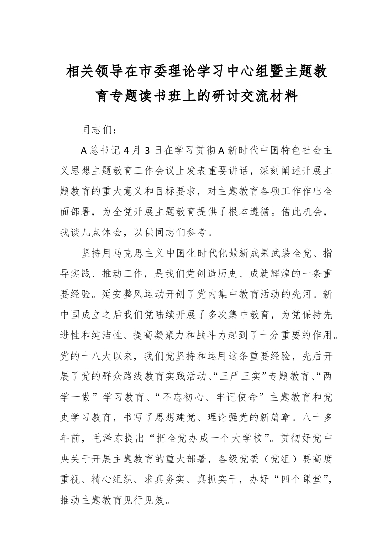 / 相关领导在市委理论学习中心组暨主题教育专题读书班上的研讨交流材料