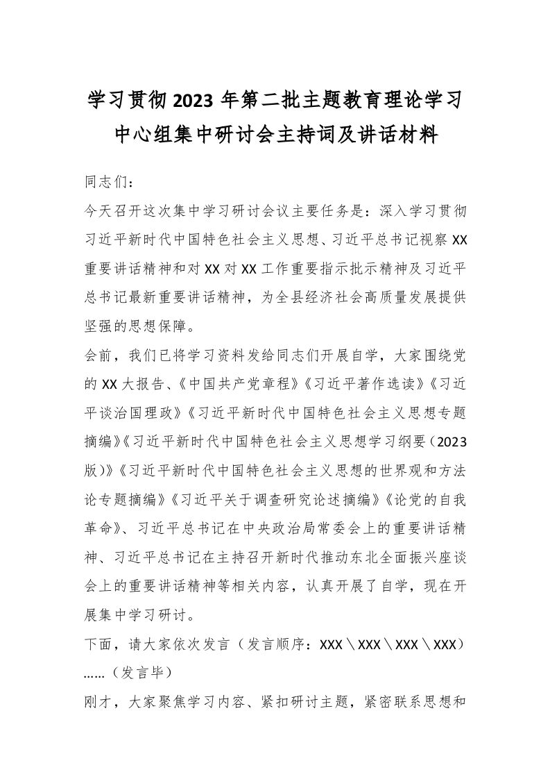 / 学习贯彻2023年第二批主题教育理论学习中心组集中研讨会主持词及讲话材料