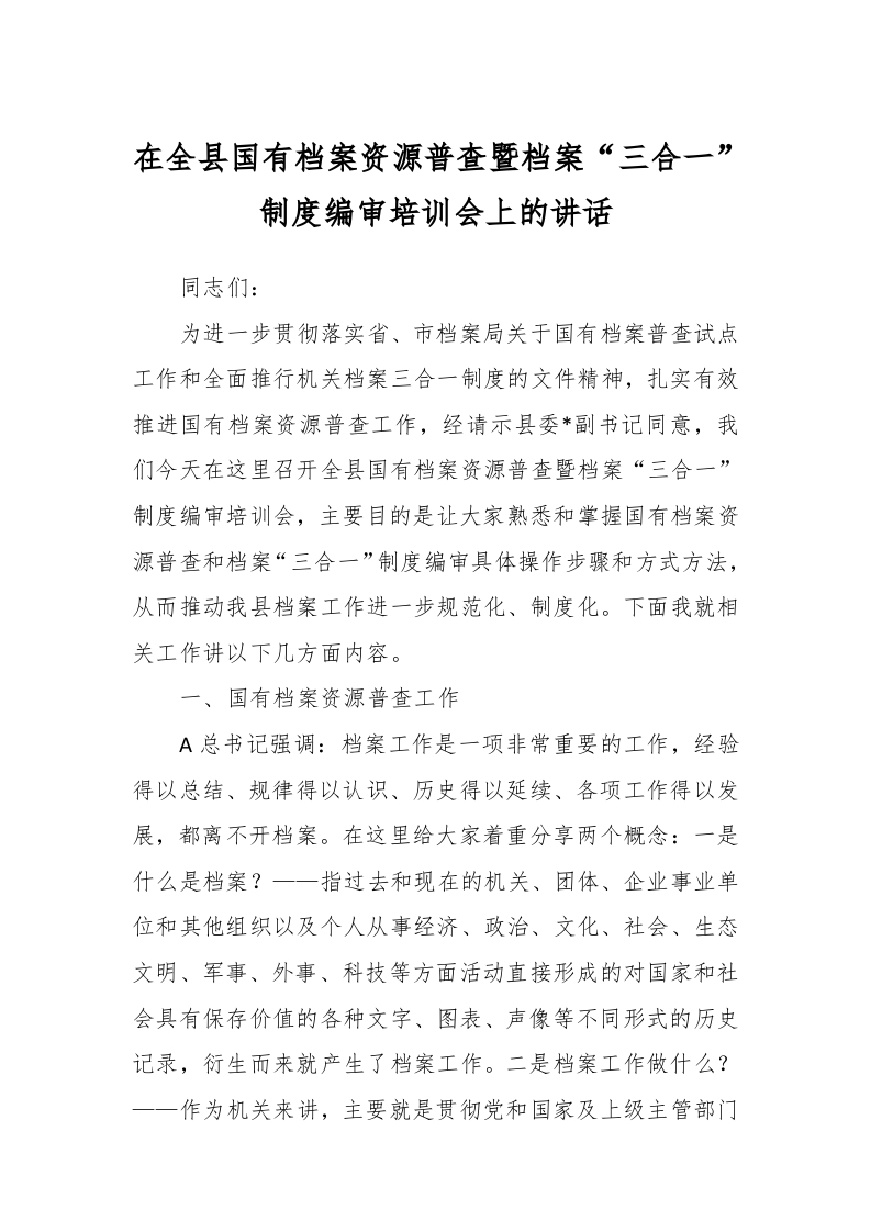 / 在全县国有档案资源普查暨档案“三合一”制度编审培训会上的讲话