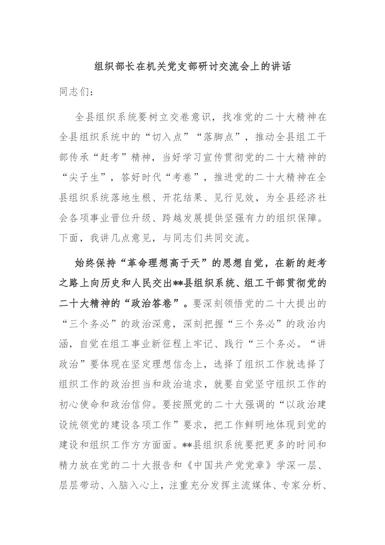 / 组织部长在机关党支部研讨交流会上的讲话