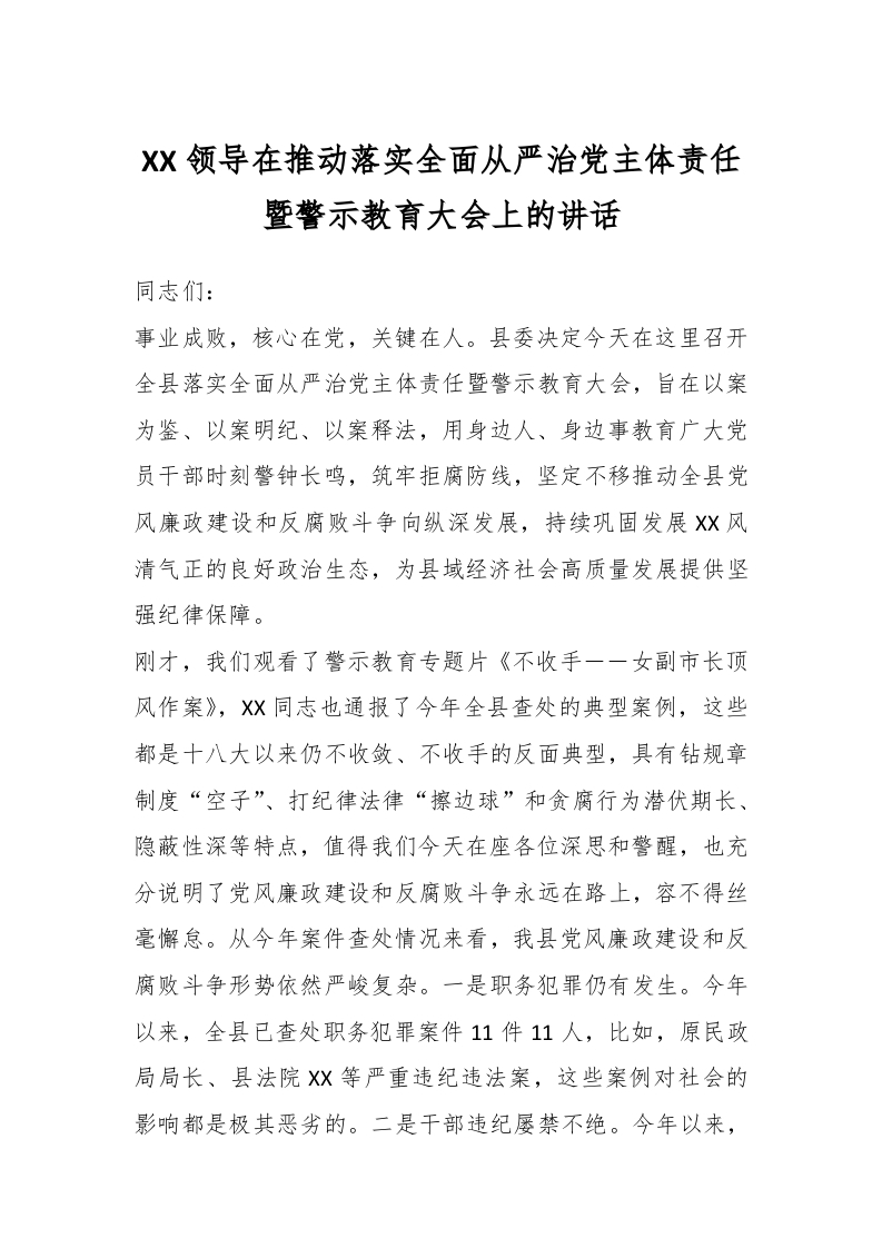 / XX领导在推动落实全面从严治党主体责任暨警示教育大会上的讲话