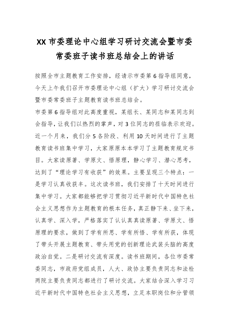 / XX市委理论中心组学习研讨交流会暨市委常委班子读书班总结会上的讲话