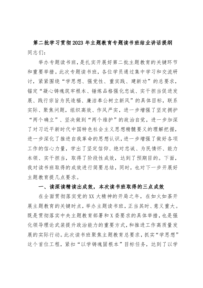 / 第二批学习贯彻2023年主题教育专题读书班结业讲话提纲