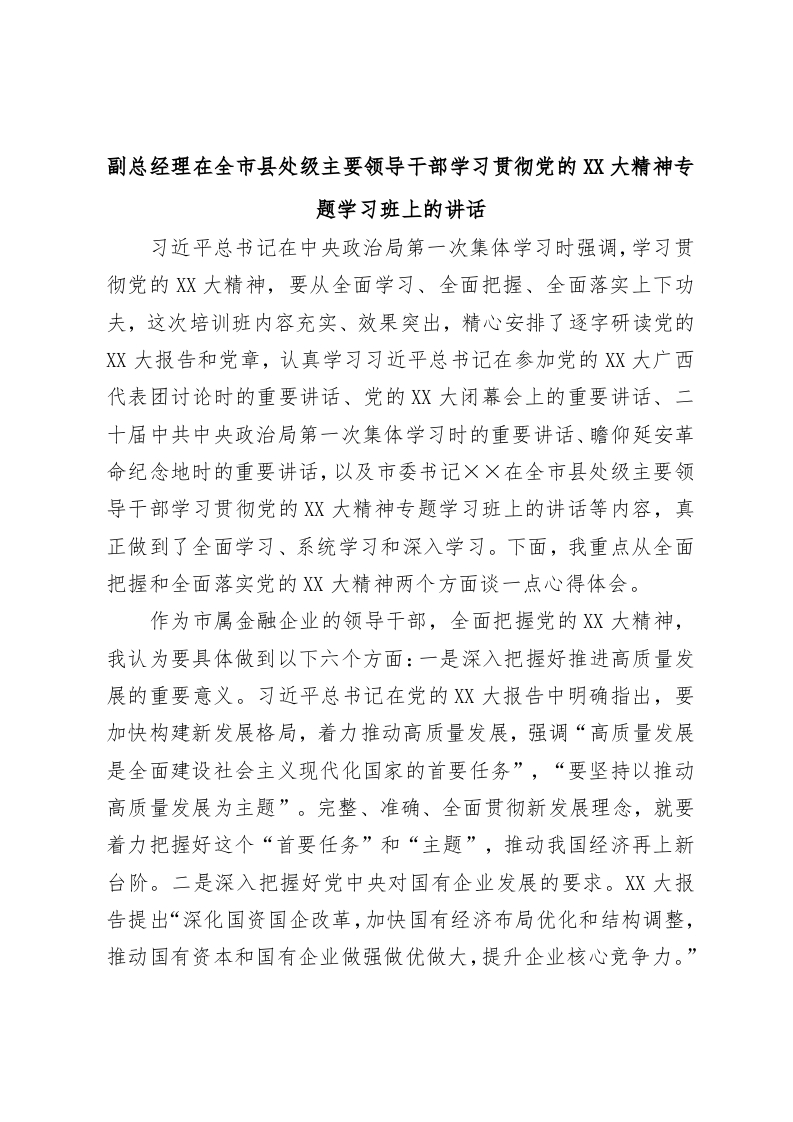 / 副总经理在全市县处级主要领导干部学习贯彻党的XX大精神专题学习班上的讲话