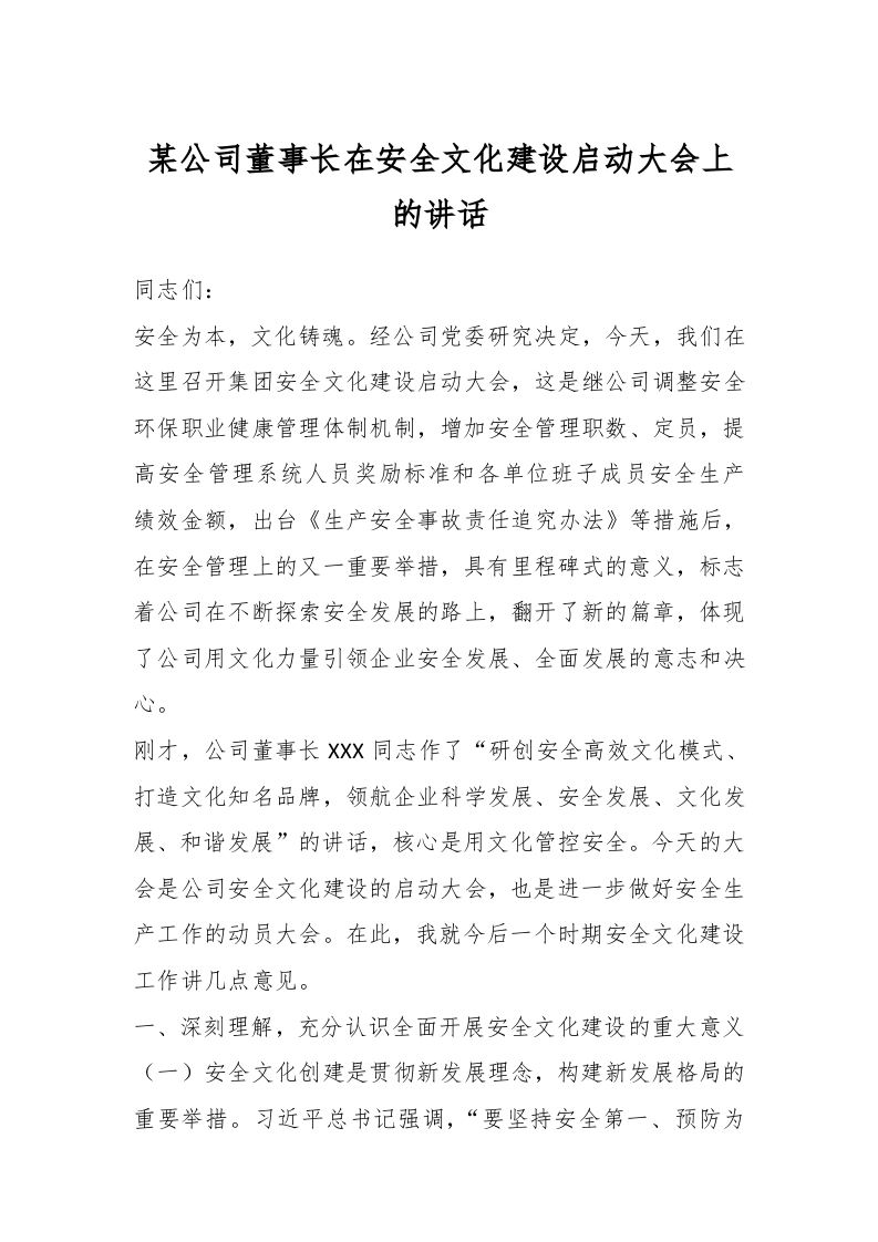 / 某公司董事长在安全文化建设启动大会上的讲话