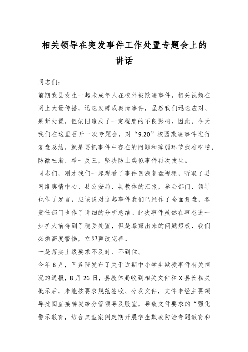 / 相关领导在突发事件工作处置专题会上的讲话