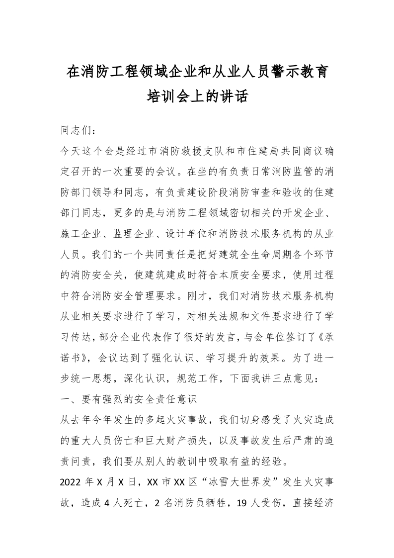 相关领导在消防工程领域企业和从业人员警示教育培训会上的讲话